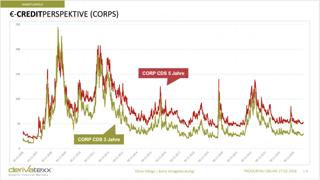 Zweitens: Die USD-Basis (Cross-Currency-Basis-Swap) ist angespannt. Die Kosten, Euro in Dollar zu tauschen, sind gestiegen – ein Zeichen für Dollarknappheit im internationalen Markt. Das ist kein akademisches Phänomen. Es verteuert die USD-Refinanzierung europäischer Banken direkt.