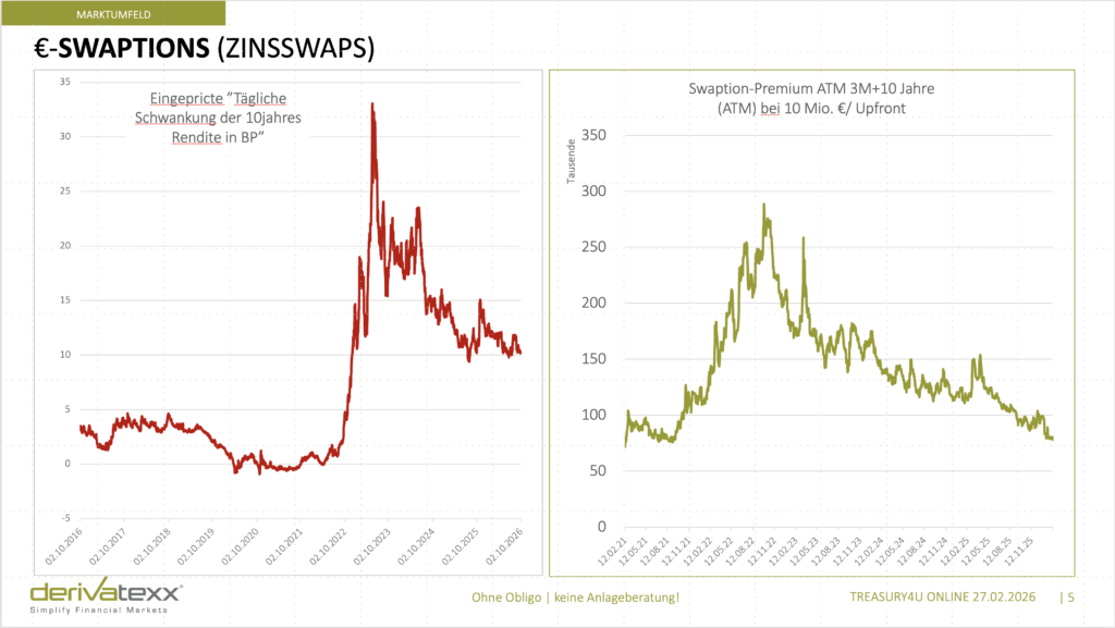 Ein Hinweis, der nicht vergessen werden sollte: Swaptions sind aktuell wieder deutlich günstiger als die letzten Jahre. Die implizite Volatilität im Zinsoptionsmarkt ist wieder deutlich zurückgegangen. Das bedeutet: Absicherungen sind preiswerter. Wer beispielsweise Long Receiver Swaptions kauft (das Recht, einen Festzins zu empfangen), sichert sich gegen sinkende Zinsen ab – und zahlt dafür heute wenig.