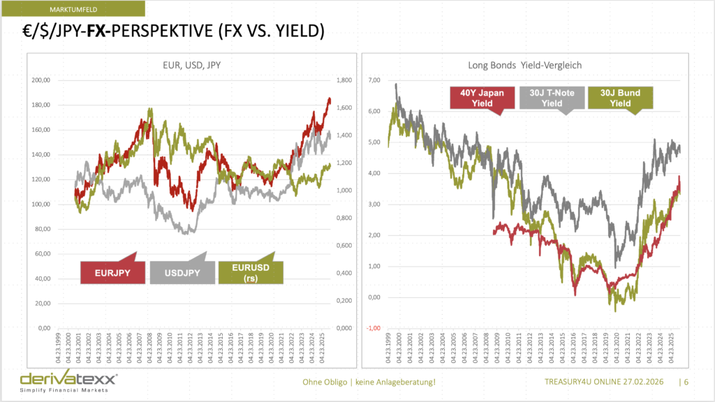 Und der Yen? Strukturell schwach. Was für japanische Exporteure ein Segen ist, bedeutet für internationale Investoren ein Währungsrisiko. Aber – und hier wird es interessant für europäische Treasurer – wer JPY-denominierte Assets hält und in Euro via kurzen FX-Swaps absichert, vereinnahmt aktuell eine Cross-Currency-Basis-Prämie von rund 130 Basispunkten. Das ist keine Kleinigkeit. Damit werden selbst moderate JPY-Renditen zu attraktiven EUR-Renditen – ohne das Zinsrisiko zu ändern. Eine Opportunität, die viele Banken noch nicht auf dem Radar haben.