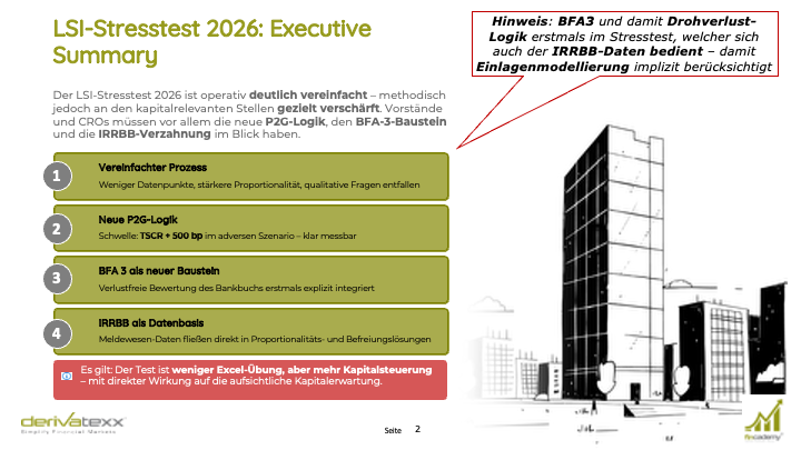 Und genau in dieses Umfeld hinein fällt nun auch noch der -geänderte- LSI-Stresstest 2026. Damit steigt der Druck, Zinsbuch, Einlagenverhalten, IRRBB und Kapitalplanung nicht mehr isoliert zu betrachten, sondern als eng miteinander verknüpfte Steuerungsgrößen. Wer heute nur auf Bilanzstruktur oder Zinsergebnis schaut, greift zu kurz – gefragt ist ein integrierter Blick auf Risiko, Verhalten und Resilienz.